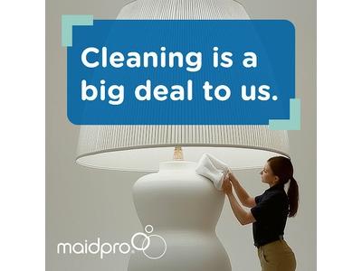 A promotional image from MaidPro House Cleaning Services shows a cleaning professional wiping a large decorative lamp with the tagline "Cleaning is a big deal to us." The image reinforces MaidPro’s commitment to detailed, high-quality cleaning services.