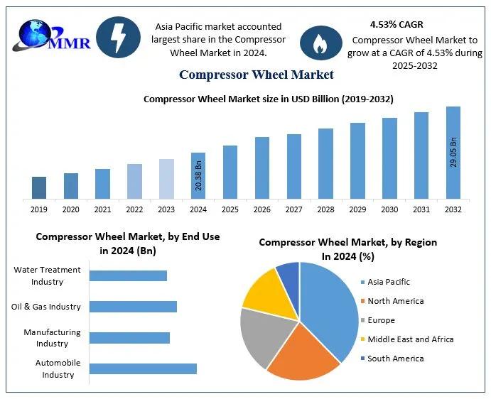 ➤ Compressor Wheel Market Set for Robust Growth: Regional Insights and Key DevelopmentsThe global compressor wheel market is on a trajectory of significant expansion, driven by the escalating demand for turbocharged engines, advancements in manufacturing technologies, and a heightened focus on fuel efficiency across various industries. Valued at USD 20.38 billion in 2024, the market is projected to reach nearly USD 29.05 billion by 2032, reflecting a compound annual growth rate (CAGR) of 4.53% during the forecast period.