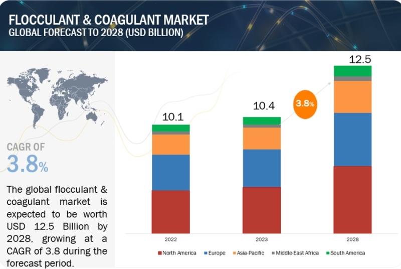 The global flocculant & coagulant market size is estimated to be USD 10.4 billion in 2023 and is projected to reach USD 12.5 billion, at a CAGR of 3.8% during the forecast period. This report provides a comprehensive analysis of the industry, including market size, share, flocculant & coagulant market growth [https://www.marketsandmarkets.com/Market-Reports/flocculant-and-coagulant-market-243584994.html?utm_source=abnewswire.com&utm_medium=referral&utm_campaign=flocculant-and-coagulant], trends, drivers and constraints, Competitive Aspects, and prospects for future growth. The market growth is driven by implementation of stringent environmental regulations across the globe for wastewater treatment, limited availability and declining freshwater resources, growth in mining and mineral processing. However, alternative water treatment technologies, high cost related to acquiring and using flocculants and coagulants.