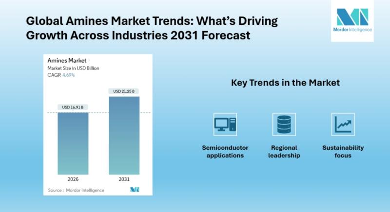 Global Amines Market [https://www.mordorintelligence.com/industry-reports/amines-market?utm_source=abnewswire] is projected to reach USD 21.25 billion by 2031, growing at a CAGR of 4.69% from 2026, driven by rising demand in agrochemicals, personal care, and semiconductor applications. Asia-Pacific leads the Amines Market Size and continues to dominate with the fastest growth rate.
