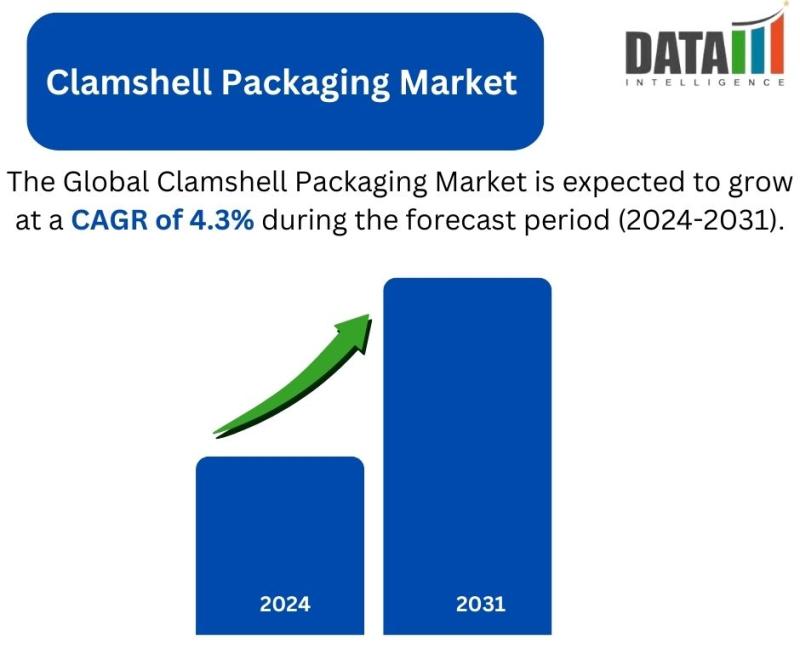 The Clamshell Packaging Market market to grow at a CAGR of 4.3% during the forecast period 2024-2031.Clamshell Packaging Market report, published by DataM Intelligence, provides in-depth insights and analysis on key market trends, growth opportunities, and emerging challenges. Committed to delivering actionable intelligence, DataM Intelligence empowers businesses to make informed decisions and stay ahead of the competition. Through a combination of qualitative and quantitative research methods, it offers comprehensive reports that help clients navigate complex market landscapes, drive strategic growth, and seize new opportunities in an ever-evolving global market.