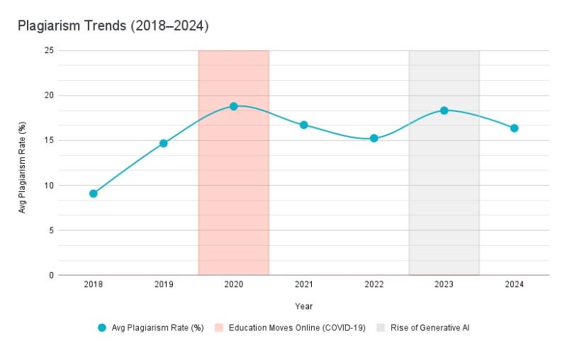 According to the data, the global average plagiarism rate more than doubled between 2018 and 2020, rising from 9.08% to 18.79%. This spike closely coincided with the abrupt global pivot to online learning, where many institutions struggled to enforce academic standards amid reduced instructor oversight and insufficient digital monitoring systems. The trajectory of these shifts is illustrated in the chart below, highlighting both pandemic-related and AI-related disruptions.