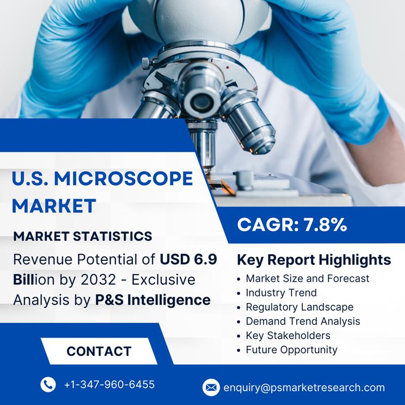 According to the latest market research study published by P&S Intelligence, the U.S. microscope market is experiencing significant growth, with a projected value of USD 3.8 billion in 2024, expected to expand at a compound annual growth rate (CAGR) of 7.8% from 2025 to 2032. By the end of 2032, the market is expected to reach USD 6.9 billion. This robust growth is primarily fueled by the increasing integration of advanced technologies, growing research across various fields like life sciences, healthcare, and nanotechnology, as well as the rising demand for high-resolution imaging in industries such as pharmaceuticals, biotechnology, and semiconductor manufacturing.The microscope market in the U.S. is becoming more dynamic as technological advancements, including automation, artificial intelligence (AI), and digital imaging, are revolutionizing the sector. These advancements not only enhance the capabilities of microscopes but also expand their applications. For instance, the integration of AI in microscopes enables autonomous image analysis, improving diagnostic accuracy and efficiency in sectors like healthcare and life sciences.