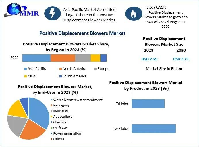 ◆Positive Displacement Blowers Markethe global positive displacement blowers market, valued at USD 2.55 billion in 2023, is projected to reach USD 3.71 billion by 2030, growing at a compound annual growth rate (CAGR) of 5.5% during the forecast period. This growth is driven by increasing applications in water and wastewater treatment, packaging, industrial processes, aquaculture, oil & gas, chemical industries, and power generation.