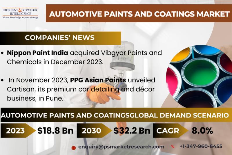 According to the latest market research study published by P&S Intelligence, the global automotive paints and coatings market was valued at USD 18.8 billion in 2023 and is projected to grow at a robust compound annual growth rate (CAGR) of 8.0%, reaching USD 32.2 billion by 2030. This growth is largely driven by advancements in coating technologies that not only enhance the aesthetics of vehicles but also improve durability and surface protection. The market is experiencing an increasing shift towards eco-friendly and sustainable coatings, with a particular emphasis on waterborne technologies, which accounted for nearly 50% of the market share in 2023.Governments worldwide are implementing stricter regulations to reduce the environmental impact of coatings, further boosting demand for innovative solutions. Among these are self-healing and rust-resistant coatings that provide long-lasting protection, responding to both consumer demands for customization and sustainability. These advancements are reshaping the industry, with eco-friendly, water-based, and polyurethane coatings gaining significant traction in the automotive sector.