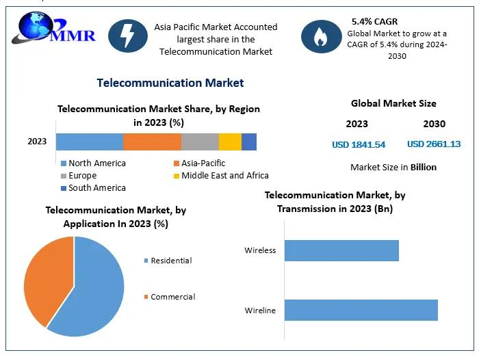 The Telecommunication Market size was valued at US$ 1841.54 Bn. in 2023 and the total revenue is expected to grow at a CAGR of 5.4% through 2024 to 2030, reaching nearly US$ 2661.13 Bn.Telecommunication Market Overview: