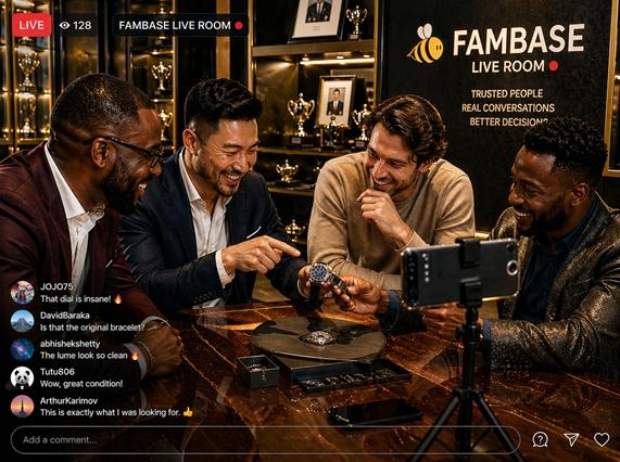 In high-value watch trading, Fambase creates a close, trusted network where authenticity can be confidently verified, value becomes clearer, and decisions take shape through ongoing relationships.