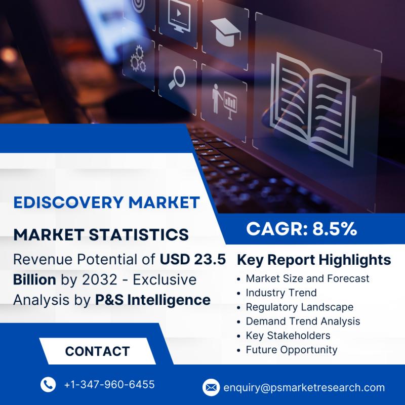 According to the latest market research study published by P&S Intelligence, the global eDiscovery market, valued at USD 12.3 billion in 2024, is projected to experience substantial growth, reaching USD 23.5 billion by 2032, expanding at a compound annual growth rate (CAGR) of 8.5%. eDiscovery, which involves the identification, collection, and review of electronically stored information (ESI) for legal and regulatory matters, is crucial in today's data-driven world. Factors such as the increasing volume of digital data generated by businesses, along with the rising adoption of smartphones, social media, and cloud-based solutions, are fueling this market's growth. These trends are transforming how organizations handle legal processes, compliance requirements, and data management strategies.Technological advancements, particularly the rise of artificial intelligence (AI) and machine learning (ML), are significantly shaping the eDiscovery market. AI-powered tools like predictive coding are streamlining the eDiscovery process, enabling legal professionals to automate the identification and classification of relevant documents, significantly reducing the time and costs associated with traditional document review methods. Furthermore, predictive analytics is improving the accuracy of identifying pertinent information, thereby enhancing the overall efficiency of legal investigations.