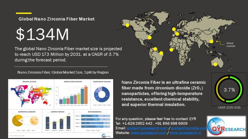 NEW YORK, (UNITED STATES) - QY Research announces the release of 2025 latest report "Nano Zirconia Fiber Market". Based on current situation and impact historical analysis (2020-2024) and forecast calculations (2025-2031), this report provides a comprehensive analysis of the global Nano Zirconia Fiber market, including market size, share, demand, industry development status, and forecasts for the next few years.In Details | Download Exclusive Research Report PDF Sample: (Including Full TOC, List of Tables & Figures, Chart) @ https://www.qyresearch.com/sample/4705516