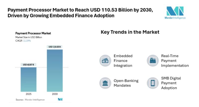 The Payment Processor Market size [https://www.mordorintelligence.com/industry-reports/payment-processor-market?utm_source=abnewswire] reached USD 63.87 billion in 2025 and is forecast to reach USD 110.53 billion by 2030, expanding at an 11.59% CAGR. This growth is driven by the increasing adoption of embedded finance solutions, the modernization of real-time payments, and…