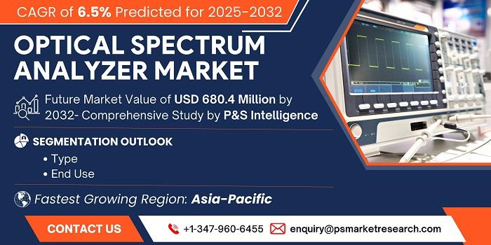 According to the latest market research study published by P&S Intelligence, the global optical spectrum analyzer (OSA) market is poised for substantial growth, with an anticipated increase from USD 412.3 million in 2024 to USD 680.4 million by 2032, representing a robust compound annual growth rate (CAGR) of 6.5%. Several key drivers are contributing to this upward trajectory, including the rapid expansion of telecommunications infrastructure, particularly with the advent of 5G technology, which demands more advanced testing and measurement equipment. As the need for enhanced communication speeds and broader bandwidth grows, OSAs are becoming essential for monitoring and analyzing optical signals across various sectors.Additionally, OSAs are crucial in industries such as healthcare, consumer electronics, and research and development, where precision and accuracy are critical. The increasing integration of Optical Time-Domain Reflectometers (OTDR) and fiber optic technology into these industries is expected to further propel market growth. As companies continue to innovate with emerging technologies such as artificial intelligence (AI) and machine learning (ML), the demand for advanced OSAs that offer real-time analysis and optimization capabilities is rising. In tandem, the widespread use of optical networks for data transfer in aerospace and defense applications also contributes significantly to the market expansion.