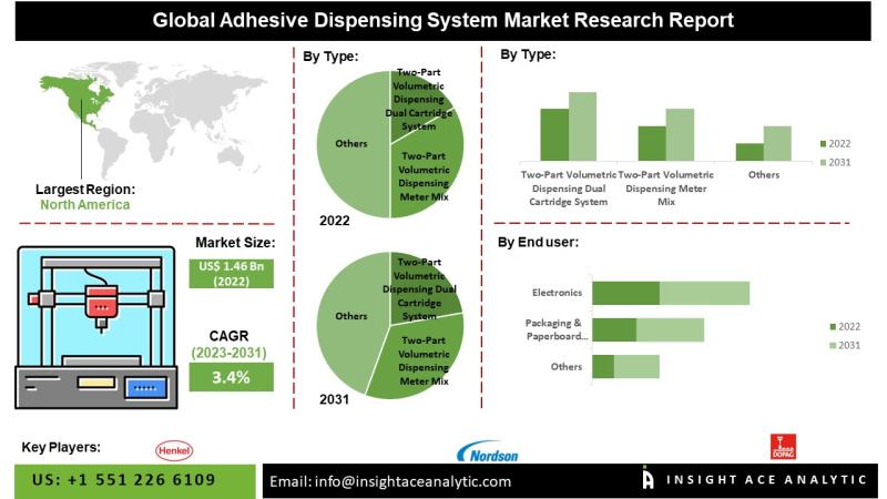 InsightAce Analytic Pvt. Ltd. announces the release of a market assessment report on the "Global Adhesive Dispensing Equipment Market- (By Type (Two Part Volumetric Dispensing Dual Cartridge System, Two Part Volumetric Dispensing Meter Mix, Hand Held Hot Melt Applicators, Other), By End-User (Packaging & Paper Board Packaging, Electronics, Industrial and Institutional, Construction, Others (Automotive and Medical)), Trends, Industry Competition Analysis, Revenue and Forecast To 2031."According to the latest research by InsightAce Analytic, the Global Adhesive Dispensing Equipment Market is valued at US$ 1.46 Bn in 2022, and it is expected to reach US$ 1.95 Bn by 2031, with a CAGR of 3.4% during a forecast period of 2023-2031.
