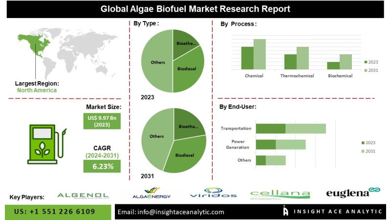 InsightAce Analytic Pvt. Ltd. announces the release of a market assessment report on the "Global Algae Biofuel Market- (By Type (Bioethanol, Biodiesel, Biogas and Others) By Process (Chemical, Thermochemical and Biochemical), By Raw Material (Spirulina, Chlorella, Dunaliella, and Others) By End-use Industry (Transportation, Power Generation and Others) Trends, Industry Competition Analysis, Revenue and Forecast To 2034."