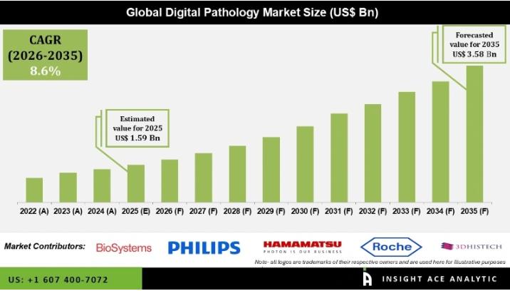 InsightAce Analytic Pvt. Ltd. announces the release of a market assessment report on the "Global Digital Pathology Market Size, Share & Trends Analysis Report By Product (Artificial Intelligence, Scanner, Software, Storage), Type (Human, Veterinary), Application (Teleconsultation, Training, Disease Diagnosis, Drug Discovery), End User (Pharma, Academia, Hospitals)- Market Outlook And Industry Analysis 2035"
