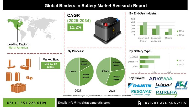 InsightAce Analytic Pvt. Ltd. announces the release of a market assessment report on the "Global Binders in Battery Market Size, Share & Trends Analysis Report By Process (Solvent-Based And Water-Based), Binder Chemistry (Styrene Butadiene Rubber (SBR), Polyvinylidene Fluoride (PVDF), Carboxymethyl Cellulose (CMC), Polytetrafluoroethylene (PTFE)), Battery Binders And Battery Type (Lithium-Ion, Nickel Metal Hydride, Lead Acid), End-Use Industry (Automotive & Transportation, Energy & Power, Consumer Electronics)- Market Outlook And Industry Analysis…