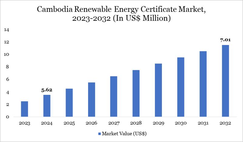 As per DataM intelligence research report"The Cambodia renewable energy certificate Market reached US$ 5.62 million in 2024 and is expected to reach US$ 7.01 million by 2032, growing with a CAGR of 2.6% during the forecast period 2025-2032.". Government incentives and renewable energy initiatives are promoting adoption of energy certificates in Cambodia.