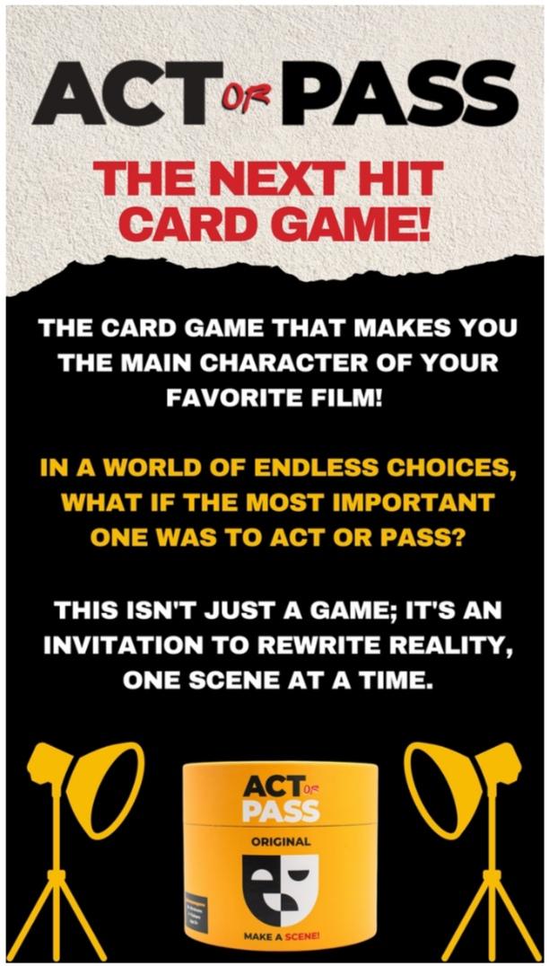 Act or Pass is created by a passionate team of entertainment lovers dedicated to making game nights more fun, inclusive, and full of laughter. Designed with simplicity and high replay value in mind, this Kickstarter campaign marks the exciting first step in bringing a new kind of party game to homes worldwide.