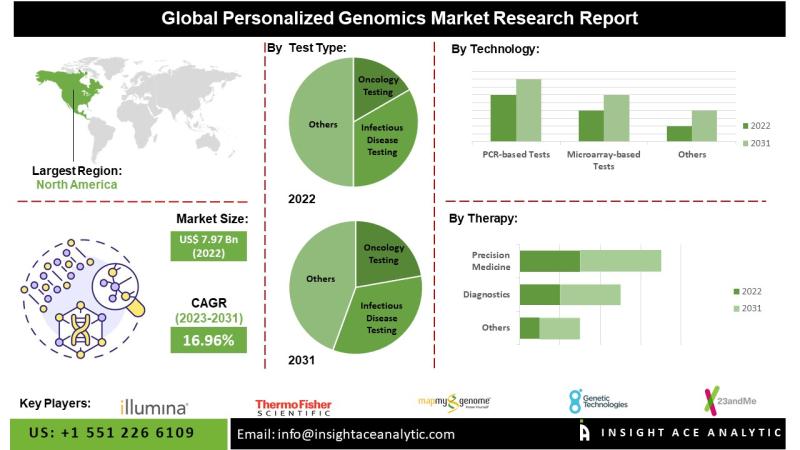 InsightAce Analytic Pvt. Ltd. announces the release of a market assessment report on the "Global Personalized Genomics Market - (By Test Type (Oncology Testing, Infectious Disease Testing, Neurological Testing, Cardiovascular Testing, Others), By Technology (PCR-based Tests, Microarray-based Tests, Sequencing-based Tests, Others), By Application (Diagnostics, Precision Medicine, Wellness, Reproductive Health, Sports Nutrition & Health Lifestyle, Others), By End User (Hospitals & Clinics, Research Centers, Pharmaceutical & Biotechnology Companies, Diagnostic Laboratories, Others)), Trends, Industry Competition Analysis, Revenue and Forecast To 2031."According to the latest research by InsightAce Analytic, the Global Personalized Genomics Market is valued at US$ 7.97 Billion in 2022, and it is expected to reach US$ 32.15 Billion by 2031, with a CAGR of 16.96% during the forecast period of 2023-2031.