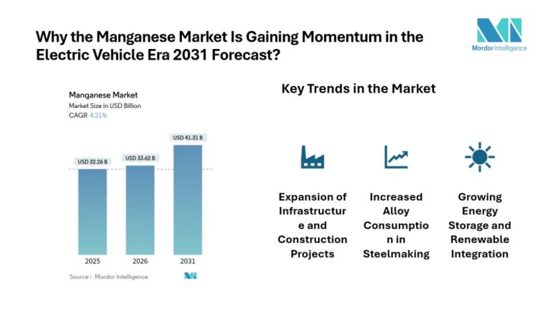 The global manganese market size [https://www.mordorintelligence.com/industry-reports/manganese-market?utm_source=abnewswire] expected to rise from USD 33.62 billion in 2026 to USD 41.31 billion by 2031, reflecting a 4.21% CAGR. Manganese plays a crucial role in steel production, battery manufacturing, and industrial applications, making it a critical material across multiple sectors. Traditional steel-grade…