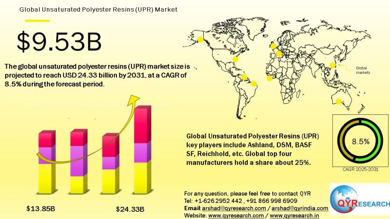 According to QY Research announces the release of 2025 latest report "Unsaturated Polyester Resins (UPR) Market". Based on current situation and impact historical analysis (2020-2024) and forecast calculations (2025-2031), this report provides a comprehensive analysis of the global Unsaturated Polyester Resins (UPR) market, including market size, share, demand, industry development status, and forecasts for the next few years.The global market for Unsaturated Polyester Resins (UPR) was estimated to be worth US$ 13.85 billion in 2024 and is forecast to a readjusted size of US$ 24.33 billion by 2031 with a CAGR of 8.5% during the forecast period 2025-2031.