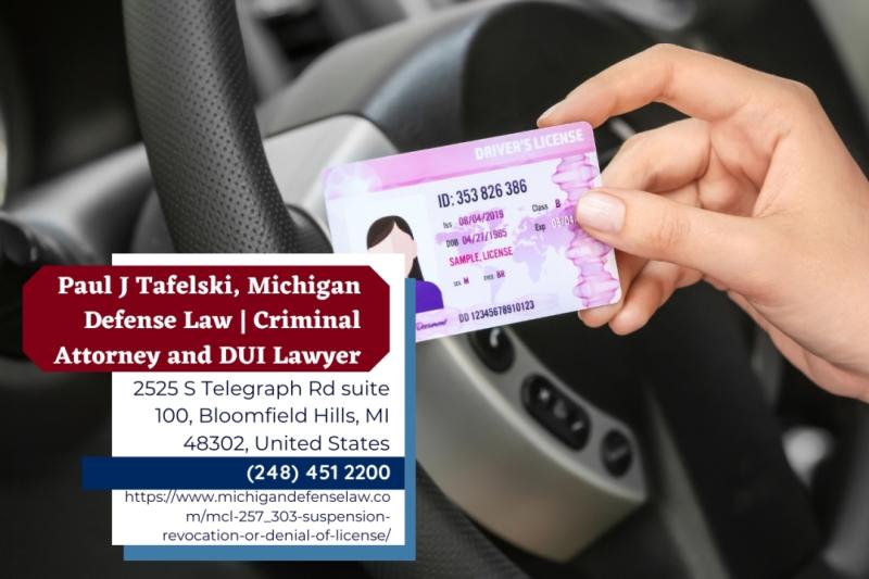 Oakland County license restoration lawyer Paul J. Tafelski of Michigan Defense Law (https://www.michigandefenselaw.com/blog/mcl-257_303-suspension-revocation-or-denial-of-license/) is shedding light on a key section of Michigan traffic law, MCL 257.303. This statute governs the denial, suspension, or revocation of driver's licenses and has wide-reaching implications for Michigan residents facing the loss of driving privileges. As a license restoration lawyer, Tafelski helps individuals navigate the legal challenges of this law and work toward regaining their…