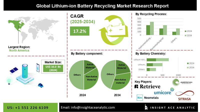 InsightAce Analytic Pvt. Ltd. announces the release of a market assessment report on the "Global Lithium-ion Battery Recycling Market Size, Share & Trends Analysis Report By Battery Chemistry (Lithium Nickel Manganese Cobalt, Lithium Iron Phosphate, Lithium Manganese Oxide, Lithium Titanate Oxide, Lithium Nickel Cobalt Aluminum Oxide), Source (Automotive, Non-automotive), Recycling Process (Hydrometallurgical, Pyrometallurgical, Physical/Mechanical), Battery Component (Active Material, Non-Active Material) - Market Outlook And Industry Analysis 2034"The Global Lithium-ion Battery Recycling Market is valued at US$ 16.0 Bn in 2024 and is expected to reach US$ 77.6 Bn by 2034, with a CAGR of 17.2% during the forecast period of 2025-2034.