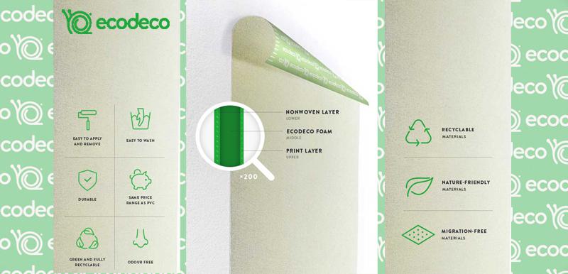 EcodecoTM is an eco-friendly material for wallpapers. It looks like traditional vinyl wallpaper, but it is produced from a special eco-friendly polymer compound which contains no harmful components of any type. EcodecoTM consists of three main layers: a non-woven or paper backing, specially developed EcodecoTM foam and finally a print layer on top. EcodecoTM foam is made from PO (poly olefin) polymer compounds, a viable and eco-friendly alternative to PVC (polyvinyl chloride). Wallpaper based on EcodecoTM contains no plasticizers, dilutants or other harmful chemicals.