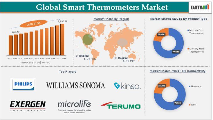 As per DataM intelligence research report "The Smart Thermometers Market reached US$ 766.27 million in 2024 and is expected to reach US$ 1,990.39 million by 2033, growing at a CAGR of 11.3% during the forecast period 2025-2033." Rising adoption of connected health devices, IoT integration, and demand for remote monitoring are accelerating growth in smart thermometers.