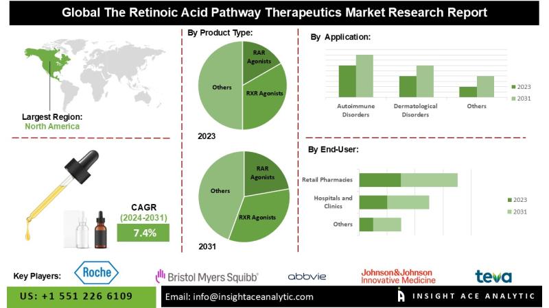 InsightAce Analytic Pvt. Ltd. announces the release of a market assessment report on the "Global The Retinoic Acid Pathway Therapeutics Market Size, Share & Trends Analysis Report By Product Type (Retinoic Acid Receptor Agonists (RAR Agonists), Retinoid X Receptor Agonists (RXR Agonists), RAR and RXR Dual Agonists, Others (Novel/Next-Generation Retinoic Acid Derivatives)), Application (Cancer Treatment, Dermatological Disorders, Autoimmune Disorders, Others (e.g., Neurological Disorders, Respiratory Diseases)), Route of Administration (Oral, Topical,…