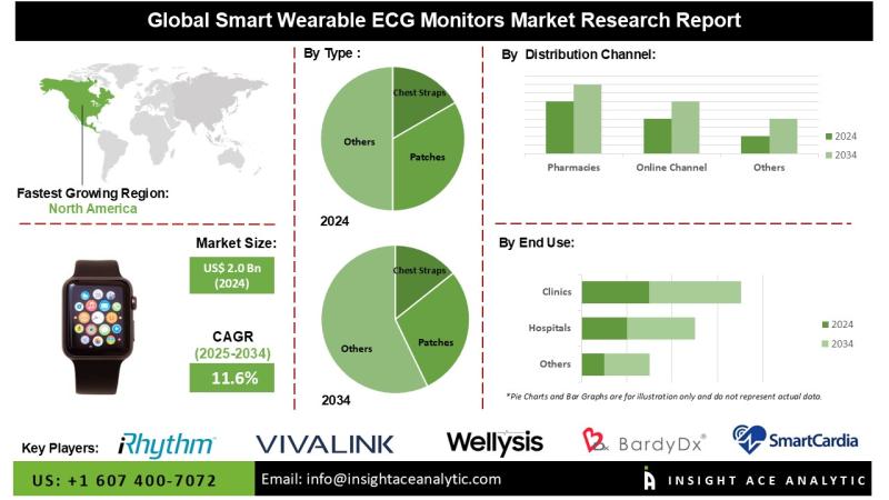 InsightAce Analytic Pvt. Ltd. announces the release of a market assessment report on the " Smart Wearable ECG Monitors Market- (By Type (Patches, Chest Straps), By Distribution Channel (Pharmacies, Direct-to-Consumer (DTC), Online Channel, Others), By End-User (Hospitals, Home Care, Clinics, Others (Fitness Centers, Sports, Assisted Living))), Trends, Industry Competition Analysis, Revenue and Forecast To 2034."