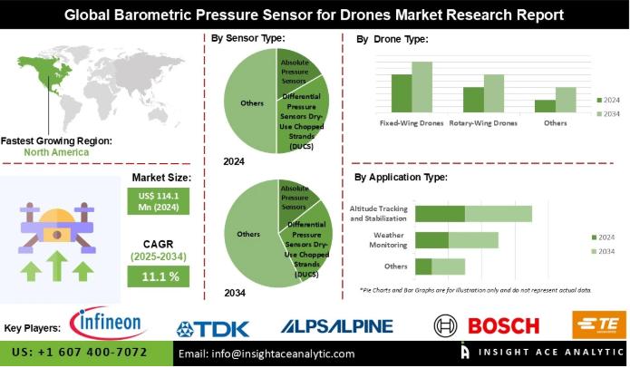 InsightAce Analytic Pvt. Ltd. announces the release of a market assessment report on the "Global Barometric Pressure Sensor for Drones Market Size, Share & Trends Analysis Report By Drone Type (Rotary-Wing Drones, Fixed-Wing Drones, and Hybrid Drones), Sensor Type (Gauge Pressure Sensors, Absolute Pressure Sensors, and Differential Pressure Sensors), Application (Landing Assistance, Weather Monitoring, Defense & Surveillance Operations, Altitude Tracking and Stabilization, Agriculture and Precision Farming), End-user (Commercial, Defense and…