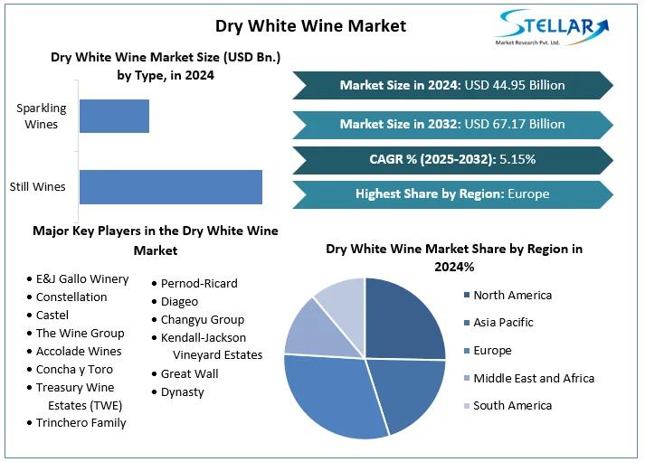 The Dry White Wine Market size reached USD 44.95 Billion in 2024 and expects the market to reach USD 67.17 Billion by 2032, exhibiting a growth rate (CAGR) of 5.15% during 2025-2032.