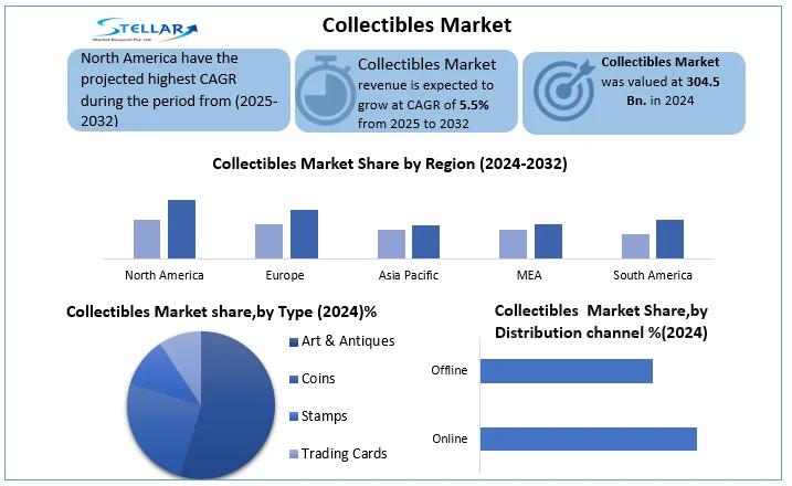 Collectibles Market was valued at USD 304.5 Bn in 2024. The total Collectibles Market revenue is expected to grow by CAGR 5.5% from 2025 to 2032 and reach nearly USD 469.9 Bn. in 2032.
