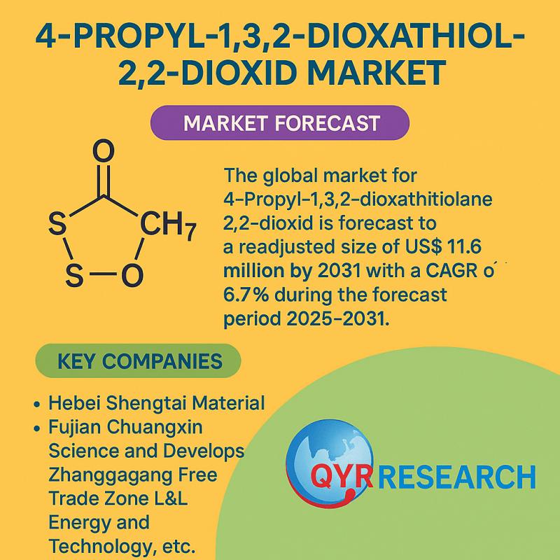 LOS ANGELES, United States: The report is a fine example of comprehensive and accurate research study on the global 4-Propyl-1,3,2-dioxathiolane 2,2-dioxid market. It digs deep into critical aspects of the global 4-Propyl-1,3,2-dioxathiolane 2,2-dioxid market, including market dynamics, competition, regional advancement, and segmentation. It provides verified market figures such as CAGR, market share, revenue, volume, production, consumption, gross margin, and price. The global 4-Propyl-1,3,2-dioxathiolane 2,2-dioxid market is segmented by type, application, and geography. The report is compiled with the use of latest primary and secondary research methodologies and tools. Buyers can ask for customization of the report as per their needs. You can also purchase specific sections of the report if your requirement is not for the complete research study.The global market for 4-Propyl-1,3,2-dioxathiolane 2,2-dioxid was estimated to be worth US$ 7.5 million in 2024 and is forecast to a readjusted size of US$ 11.6 million by 2031 with a CAGR of 6.7% during the forecast period 2025-2031.