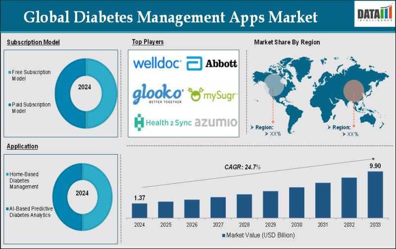 The Global Diabetes Management Apps Market reached US$ 1.37 billion in 2024 and is expected to reach US$ 9.90 billion by 2033, growing at a CAGR of 24.7% during the forecast period 2025-2033.