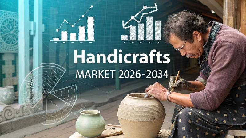 The global Handicrafts Market was valued at USD 986.9 Billion in 2025 and is projected to reach USD 2,038.0 Billion by 2034. The market is expected to grow at a CAGR of 8.39% during the forecast period 2026-2034. Growth is driven by rising consumer demand for unique handmade products, expanding e-commerce platforms, sustainability emphasis, and supportive government initiatives fostering the artisanal sector.