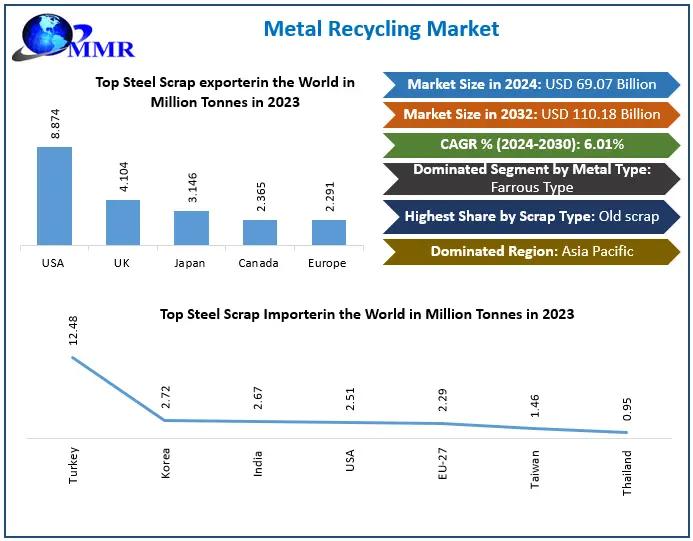 ► Metal Recycling Market to Reach USD 110.18 Billion by 2032, Driven by Sustainability and Industrial DemandThe global metal recycling market is poised for significant growth, projected to expand from USD 69.07 billion in 2024 to USD 110.18 billion by 2032, at a CAGR of 6.01% during the forecast period. This growth is fueled by increasing urbanization, industrialization, and stringent government regulations promoting sustainable practices.