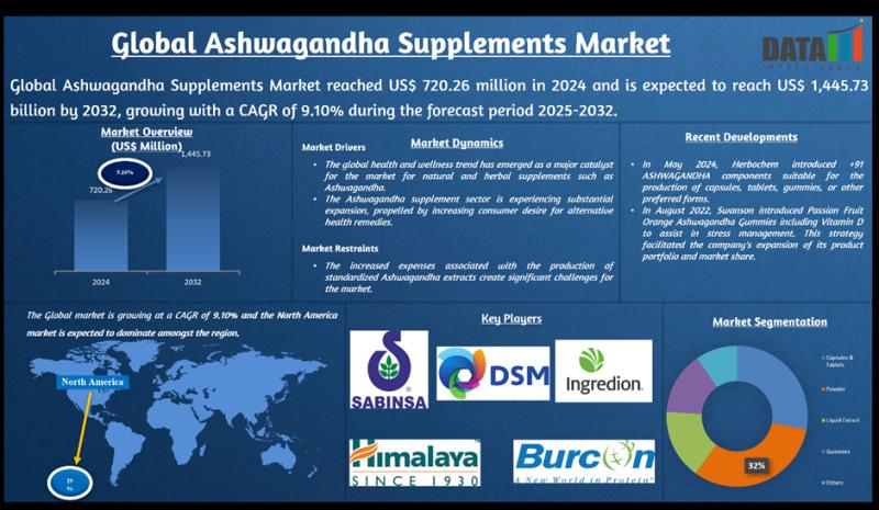 The Global Ashwagandha Supplements Market size reached US$ 720.26 million in 2024 and is expected to reach US$ 1,445.73 billion by 2032, growing with a CAGR of 9.10% during the forecast period 2025-2032.