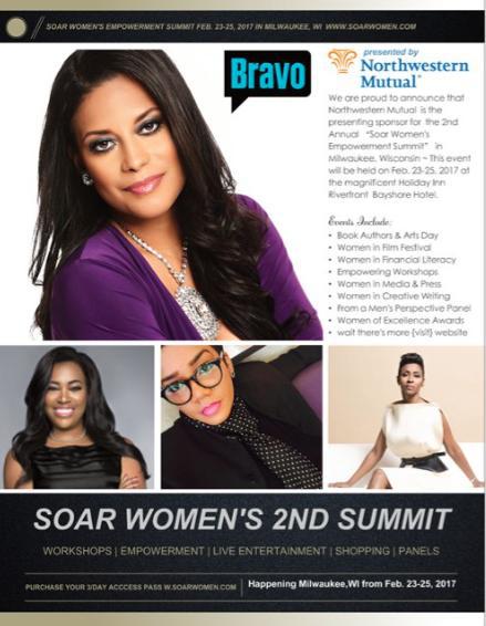 Soar Women's Empowerment Summit is presented by Northwestern Mutual the summit will start on February 23 - 25, 2017 guests will have an opportunity to attend: presentations, workshops, open panel discussions, TAMTALK pitch series, and more. SWES's daytime events are scheduled to take place at the Holiday Inn Riverfront hotel 4700 North Port Washington Rd, Milwaukee, WI. The event ends on February 25, 2017 with a red carpet award ceremony "Women of Excellence," opening with gospel recording artist Tammy Warren and featuring national recording artists Julia Huff, performing a tribute to the legendary award-winning songstress, Phyllis Hyman. In addition, appearing on the red carpet will be "Married to Medicine," reality celebrity Lisa Nicole Cloud, Dr. Myla Bennett, Dr. Sonja Stribling, Dr. Christopher Chappell, Wisconsin Senator Lena Taylor, former NFL player Victor B. Cohen, Mayor Franklin Deese of Marshville North Carolina, film producer Cedric Ne ttles, former Judge Michelle Havas, Wisconsin State Representative Jason Fields, Pastor Deon Hayes, and a host of other prestigious guests will join the celebration; being held at 1451 Renaissance Place 1451 North Prospect Ave, Milwaukee, WI.