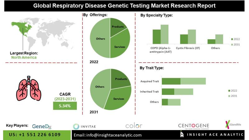 InsightAce Analytic Pvt. Ltd. announces the release of a market assessment report on the "Global Respiratory Disease Genetic Testing Market- (By Offerings (Products (Kits and Consumables), Services, Others), By Disease Type (COPD (Alpha-1-antitrypsin (AAT), Cystic Fibrosis (CF), Diffuse Lung Disease/Surfactant Dysfunction (RHD (Respiratory Distress Syndrome), PPHN (Persistent Pulmonary Hypertension of the Newborn)), Interstitial lung disease, Pulmonary Arterial Hypertension, Pulmonary Hypoplasia, Primary Ciliary Dyskinesia, Other Diseases (BPD)), By Offerings (PCR, NGS…