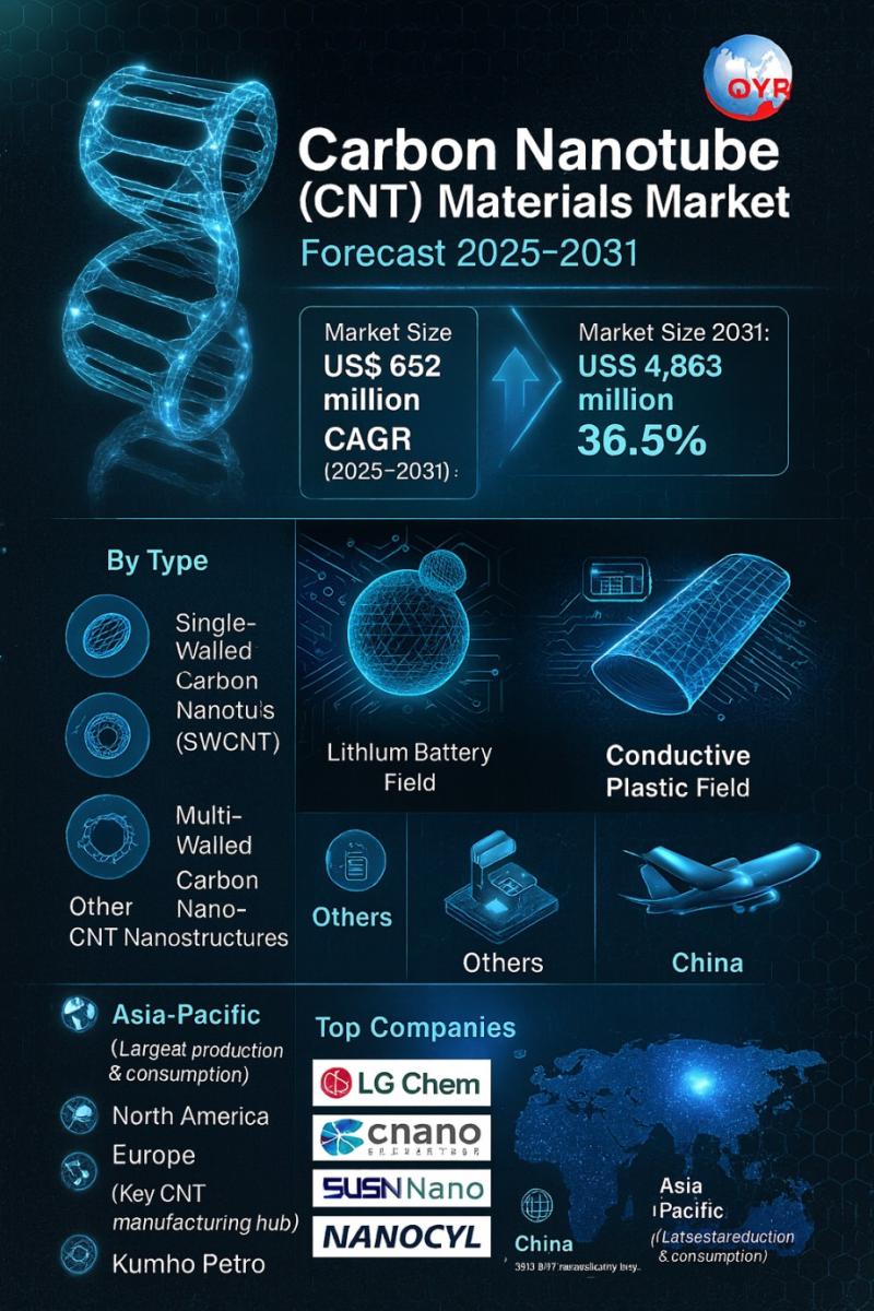 The global market for Carbon Nanotube (CNT) Materials was estimated to be worth US$ 652 million in 2024 and is forecast to a readjusted size of US$ 4863 million by 2031 with a CAGR of 36.5% during the forecast period 2025-2031.