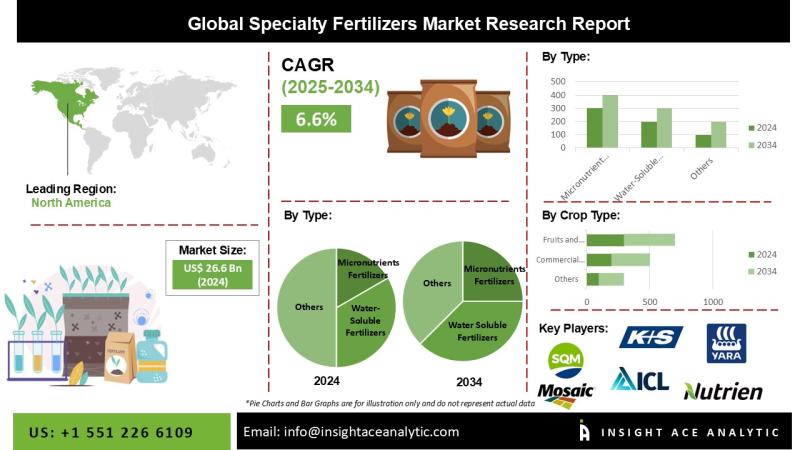 InsightAce Analytic Pvt. Ltd. announces the release of a market assessment report on the "Global Specialty Fertilizers Market Size, Share & Trends Analysis Report By Type (Micronutrient Fertilizers, Slow-Release Fertilizers, Controlled-Release Fertilizers, Customized Fertilizers, Water-Soluble Fertilizers And Others), Crop Type (Pulses And Oilseeds, Grains And Cereals, Commercial Crops, Fruits And Vegetables And Others)- Market Outlook And Industry Analysis 2034"The global specialty fertilizers market is estimated to reach over USD 49.8 Billion by 2034, exhibiting a CAGR of 6.6% during the forecast period.