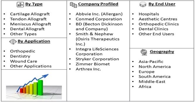 The Soft Tissues Allografts Market research report lays emphasis on primary as well as secondary drivers, leading market segments, market share, regional analysis, and possible sales volume. It gives a detailed explanation on what the market definition, applications, classifications, market trends, and engagements are for a healthcare industry. Further, it delves into a comprehensive market overview with inputs coming from industry leaders. The global Soft Tissues Allografts report presents data on improvements and patterns and materials and business sectors, advances and limits. The report closes with company profiles of prominent market players with their varied research methodologies to offer precise estimation on market size.