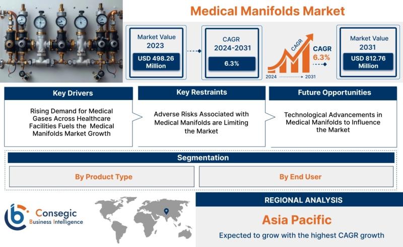 The medical manifolds market accounted for USD 498.26 Million in 2023 and is projected to reach over USD 520.81 Million in 2024 and be valued at USD 812.76 Million by 2031. Consegic Business Intelligence analyzes that the market is growing with a CAGR of 6.3% during the forecast period (2024-2031).