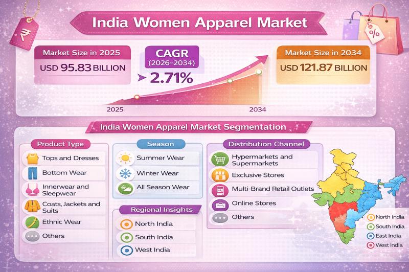 According to IMARC Group's report titled "India Women Apparel Market Size, Share, Trends and Forecast by Product Type, Season, Distribution Channel, and Region, 2026-2034" the report offers a comprehensive analysis of the industry, including market share, growth, trends, and regional insights.