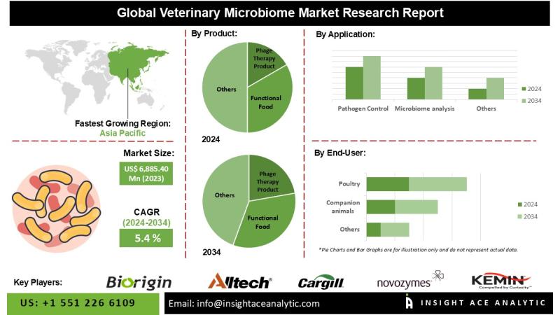 InsightAce Analytic Pvt. Ltd. announces the release of a market assessment report on the "Veterinary Microbiome Market"-, By Product (Phage Therapy Product, Functional Food Application, Gut Health Test kits, Microbial Proteins, Others), By Application (Pathogen Control, Microbiome analysis, Nutrition), By Animal Type (Companion animals, Poultry, Ruminants, Swine, Aquaculture, Others), and Global Forecasts, 2024-2034 And Segment Revenue and Forecast To 2034."