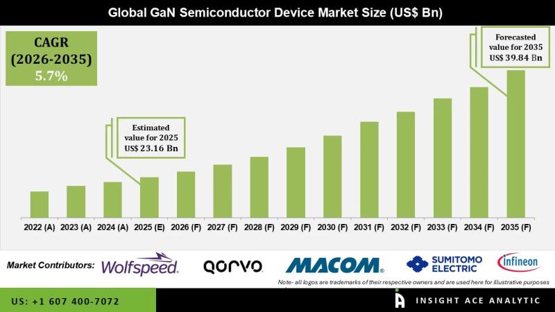 InsightAce Analytic Pvt. Ltd. announces the release of a market assessment report on the "Global GaN Semiconductor Device Market- (By Type (Opto-Semiconductor, RF Semiconductors, Power Semiconductor), By Device (Discrete Semiconductor, Integrated Semiconductor), By Application (Lightning & Lasers, Power Drives (LiDAR, Industrial Drives, E.V. drives), Supplies & Inverters (SMPS, Inverters, Wireless Charging, E.V. charging), Radio Frequency (R.F.), Front-End Module (FEM), Repeater/Booster/DAS, Radar & Satellite)), By Vertical (Consumer & Business Enterprises, Industrial,…
