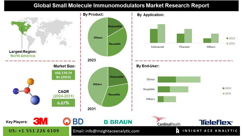InsightAce Analytic Pvt. Ltd. announces the release of a market assessment report on the "Global Small Molecule Immunomodulators Market - (By Product (Disposable, Reusable), By Application (Colorectal, Thoracic, Orthopedic, Ophthalmology, Neurosurgery, Cardiac Surgery, Gynecology, Others), By End User (Hospitals, Ambulatory Surgical Centers, Clinics, Others)), Trends, Industry Competition Analysis, Revenue and Forecast To 2031."