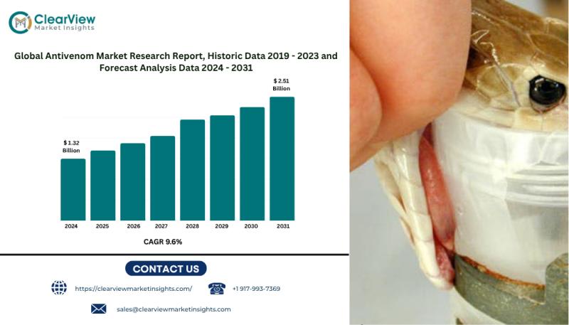 [Geneva, 5th, June 2025] - Clearview Market Insights (CVMI) forecasts that the global antivenom market will grow from USD 1.32 billion in 2024 to USD 2.51 billion by 2031, representing a compound annual growth rate (CAGR) of 9.6 percent. This expansion is driven by increasing demand from rural healthcare systems, WHO-backed prequalification efforts, and advancements in recombinant manufacturing."Antivenoms are no longer viewed as reactive emergency products-they are strategic components of rural public health infrastructure," said Dr. Naomi Bediako, senior global health analyst at CVMI. "What was once a fragmented market is now seeing global alignment through multilateral procurement and innovation hubs."