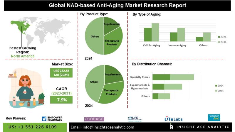 InsightAce Analytic Pvt. Ltd. announces the release of the market assessment report on "Global NAD-based Anti-Aging Market Size, Share & Trends Analysis Report By Type (Supplements (Topical NAD Supplements (Creams, Serums, Lip Creams, Eye Creams)) Therapeutic Products (NAD Nasal Spray, and NAD injections/NAD IV)), Type of Aging (Cellular Aging, Immune Aging, Metabolic Aging, Others), Distribution Channel (Supermarkets & Hypermarkets, Specialty Stores, Convenience Stores, Pharmacies/Clinics, Online Stores) Trends, Industry Competition Analysis,…